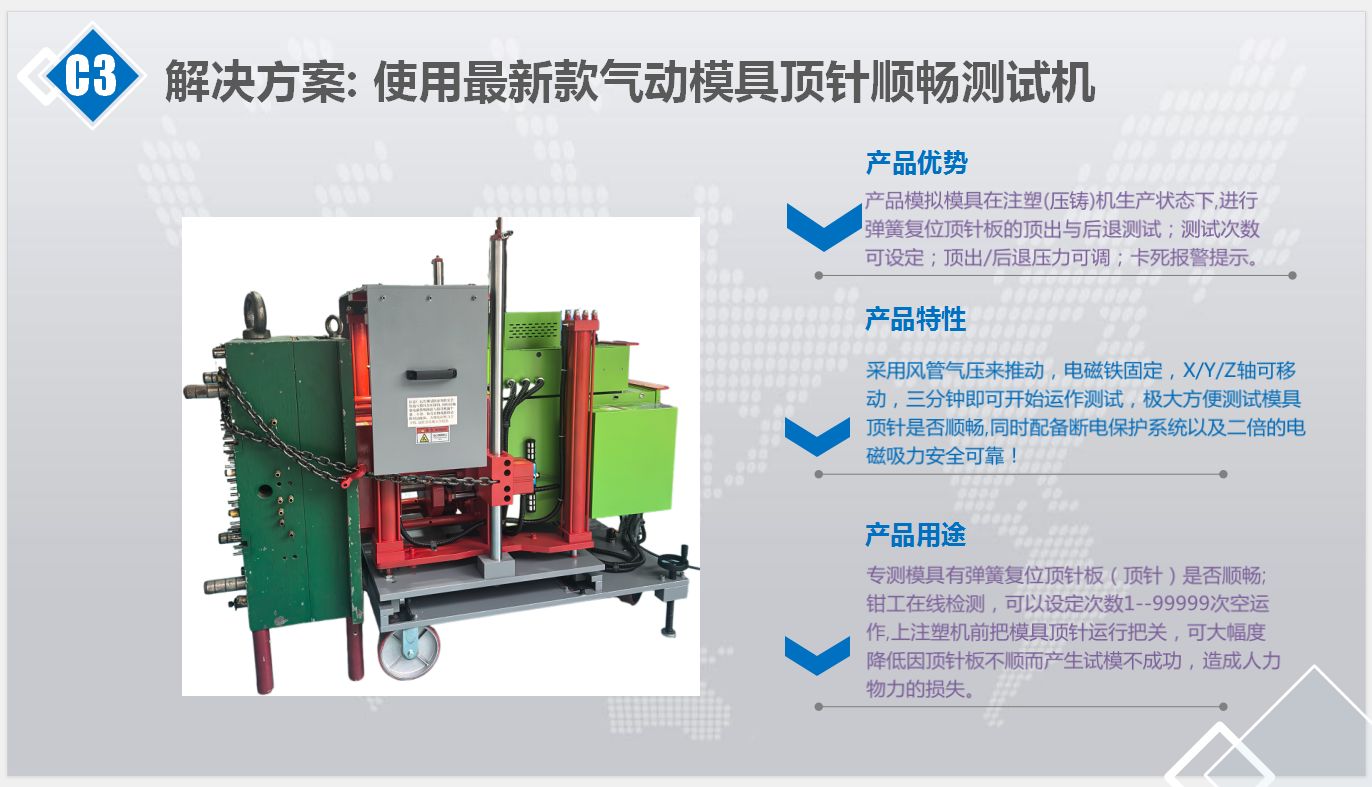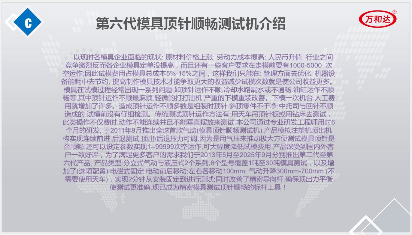为了满足更多客户的需求我们于2025年10月推出第六代产品, 产品类型:分2个系列,六个型号覆盖1吨至30吨模具测试,实现2分钟从安装固定到进行测试;同时加强电磁铁附力与精密换向阀,使顶出力平衡使测试更准确!
